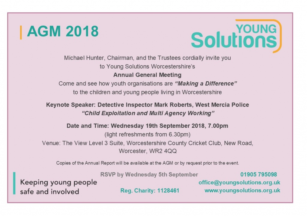 You are cordially invited to join Michael Hunter, Chairman and the Trustees at the Annual General Meeting of Young Solutions Worcestershire.