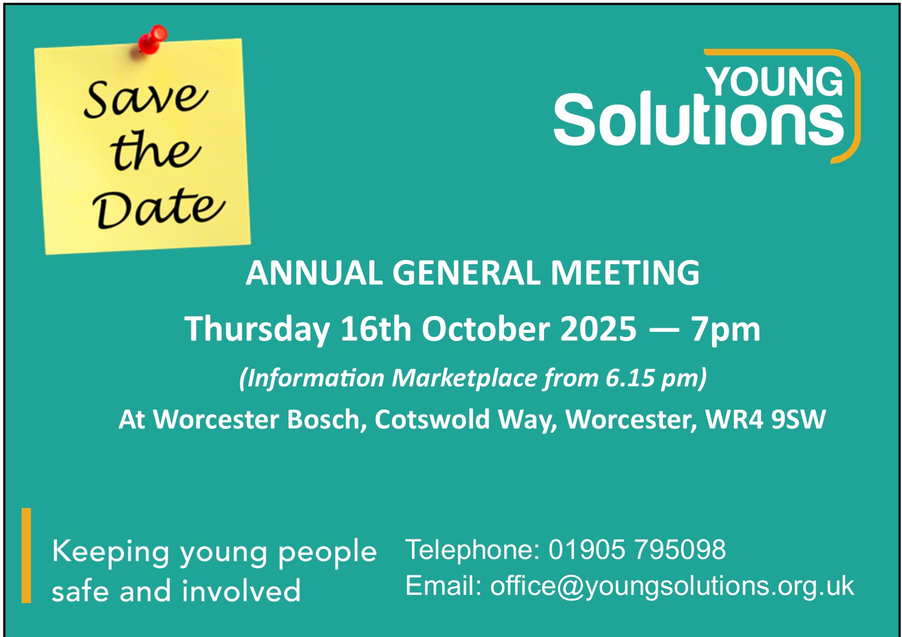 July 22, 2025 in Events, News Thurs 16th Oct – Young Solutions AGM Jo Bradley 0 Like Post Please save the date for our Annual General Meeting, which will be held on Thursday 16th October.